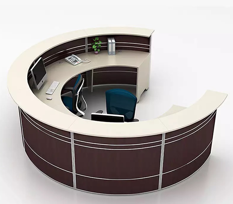 Create a welcoming first impression with this semi‑circular reception desk, designed with a light‑colored countertop and rich dark wood paneling accented by horizontal metallic lines. The curved design maximizes space efficiency while offering a professional, contemporary look.